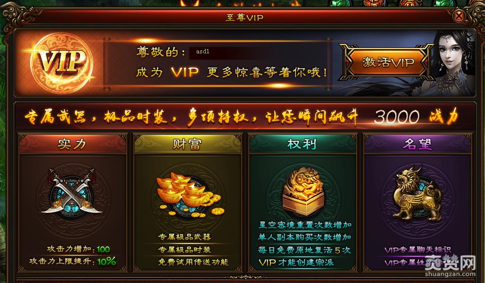 首次购买VIP可以获得时装武器和衣服体验卡一份,同时还能获得双倍经验丹和其他稀有道具。在VIP期间,玩家可以获得大量攻击力提升、免费的传送功能、星空秘境重置次数提升、每日副本购买次数提升、每日免费原地复活5次,同时,VIP玩家才可以创建宗派,并且拥有专属的聊天标识和姓名标识。因此,拥有专属VIP特权是高端玩家的首选!