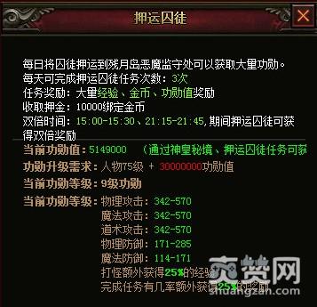 顺带一提,上面提到了功勋值有什么用?这个可是你以后升级功勋境界所需要消耗的cost,升级到了9级功勋所获得的的属性加成可是相当惊人的,三属性攻击都增加324-570点,物理防御增加171-285点,魔法防御增加114-171点,而且还能获得打怪额外27%的经验追加,完成任务有可能获得额外27%的奖励!对于上面的加成奖励,每天你都比别人多N倍经验,升级快离不开它,最重要的是这属性是长期性的。