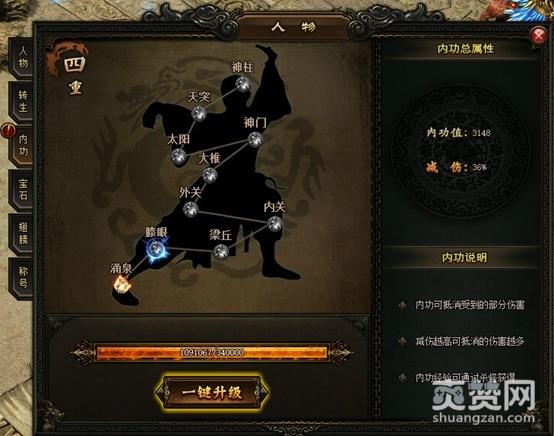 1.内功系统对于PK打怪十分重要,内功可减免大量的伤害,大大减少PK打怪中被秒杀的几率;
