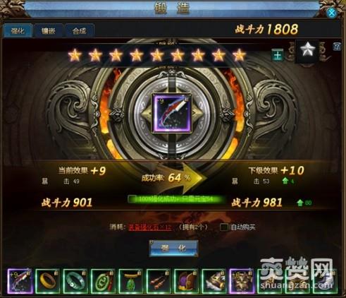 如上图所示,消耗【强化石】,可以对装备进行升星,强化成功则点亮星星,相应属性获得提升。