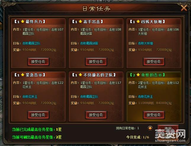 日常任务:分为一至十星日常任务,全部都为打怪任务,消耗玩家时间,可提供大量经验。玩家每完成一个日常任务,即可刷新新的4个日常任务,有一定概率升星、保持当前星级、降低星级。