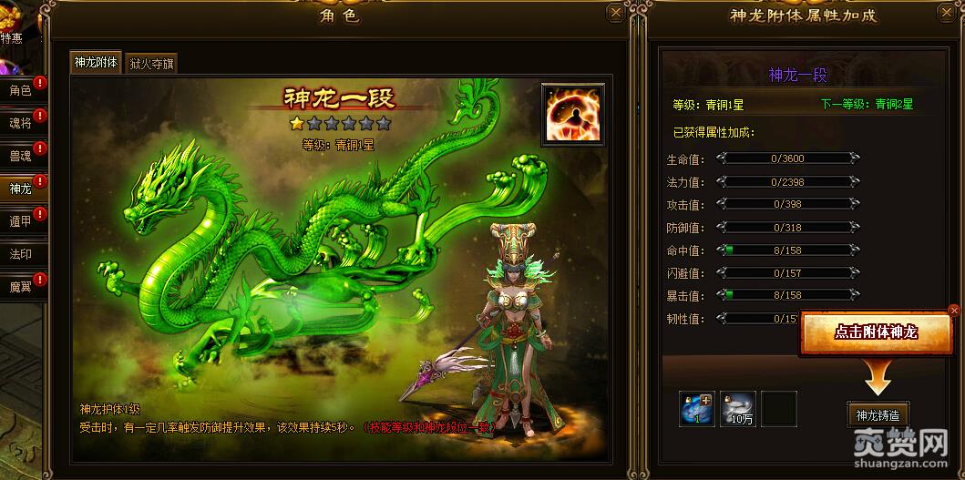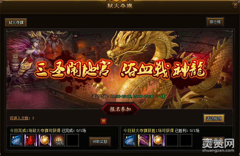 狱火夺旗是3v3随机阵营战PK战,完成活动获得经验和奖励道具,道具可以在附体神龙中使用,进行神龙升级获得属性增加。