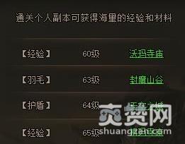 材料副本:沃玛寺庙(经验副本)、封魔山谷(羽毛副本)、天空之城(护盾副本)、祖玛寺庙(经验副本)、赤月神殿(宝石副本)等等。