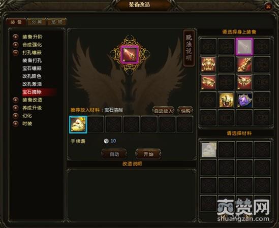 2、打开宝石摘除界面, 放入已镶嵌了宝石的装备,选择想要摘除宝石的孔洞,并放入对应宝石等级的宝石溶剂,最后点击“开始”按钮。