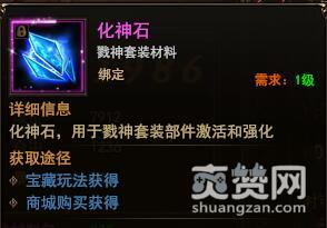 那么如何获得造型这么帅气的戮神套装呢?激活一个戮神部件需要小伙伴们用20个化神石!也就是说想要获得一套戮神,需要小伙伴们花费260个化神石!化神石的获得只能通过玩家到达250级开启的宝藏玩法获得或是从商城直接购买,化神石不仅能够用于激活组件还能够用于强化套装部件,大幅提高属性。