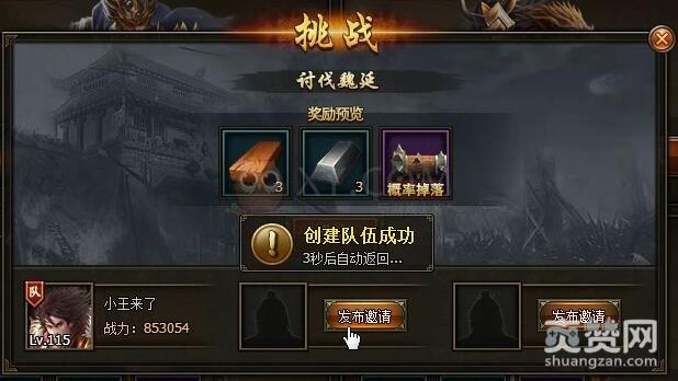 挑战之后,会进入组队界面,如果你的战力是10万,强烈建议3人组成一小队共同挑战。