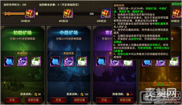 越高级的宝藏开采的时间就越长,当然奖励也会越高!每天有限定的能量,开采和探索都要消耗对应的能量!探索宝藏需要绑元或者元宝!抢夺别人的宝藏会获得相对应的奖励!反之你的被抢后也会减少奖励!抢夺其他人的宝藏会获得相对应的抢夺积分,积分达到一定数值可以获得宝箱!抢夺积分每日0点重置!