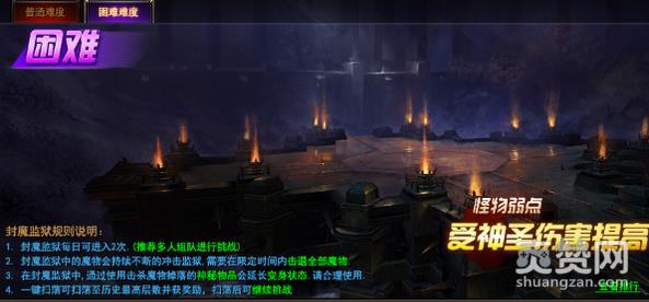 总的来说,想要通关困难的封魔监狱其实是相当简单的!如何判断自己能不能通关困难的封魔监狱呢!小伙伴们在进入困难级时,千万不要用任何一个技能,就随便打,变不变身都没差的,只要不要用技能,小伙伴们能打到第11关,那么运气好,多来几个技能的话就过了,想要稳妥的话,建议小伙伴们等到了12关以后再放技能!通关奖励是40个弩炮升阶石,5个高级弩炮升阶石!