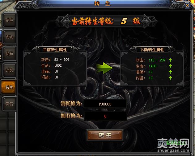 转生分为15个等级,等级越高可获得更多的各项属性加成,极大的提升角色的战斗力。 每个转生等级均有相对应的转生装备,不仅拥有比普通装备更为华丽的外形,更有着十分强大的属性。