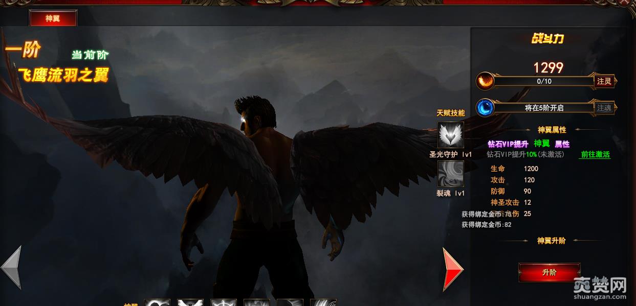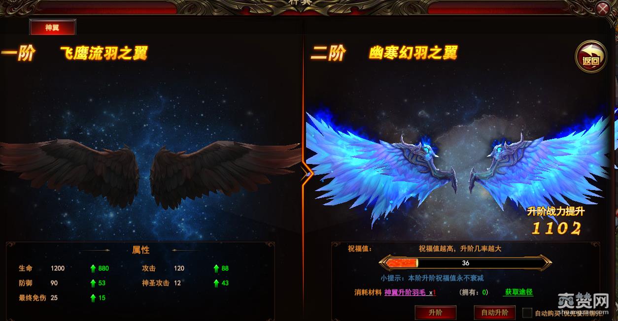 升阶需要消耗神翼升阶羽毛,每次消耗就会增长一次祝福值,当祝福值满后即可升阶神翼。