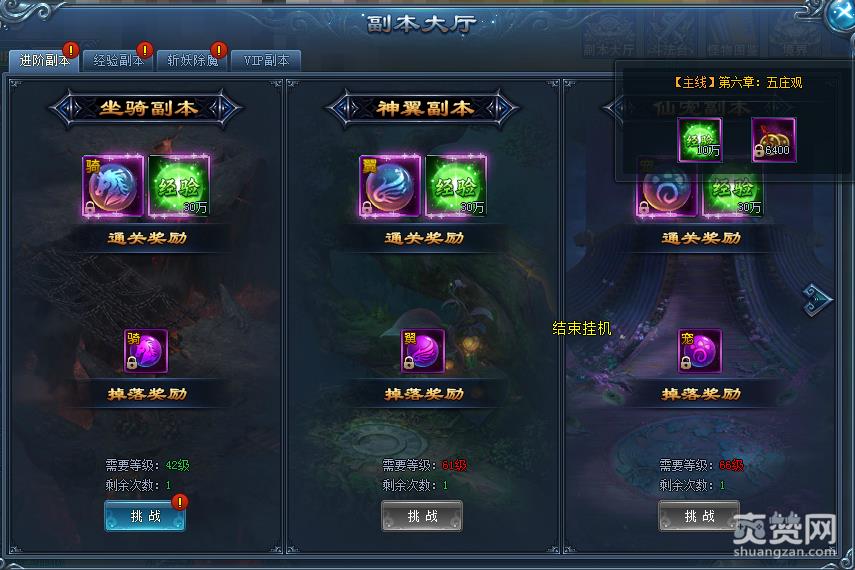 完成以上副本后可获取大量灵气值、经验、绑定元宝、进阶丹。
