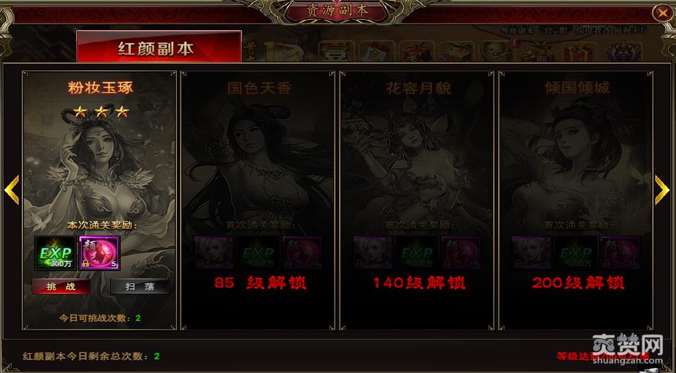 红颜副本分4个等级区间,越高区间的红颜副本获得的经验更多、碎片更好。