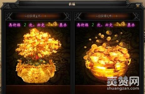 进入祈福系统的页面后会发现,每次祈福后玩家就能获得海量的祈福金币和礼券。每日祈福可进行五次,前一次属于免费祈福,只需要动动手指头就能获得200000蓝月传奇金币和100礼券。祈福时还能发生暴击,暴击后可获得金币礼券将翻倍。