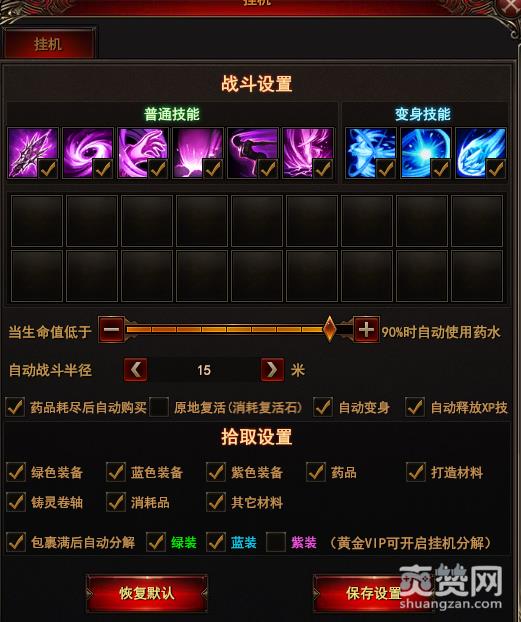 挂机设置可选择挂机时的一些偏好设定,如释放什么技能、拾取什么装备等等。