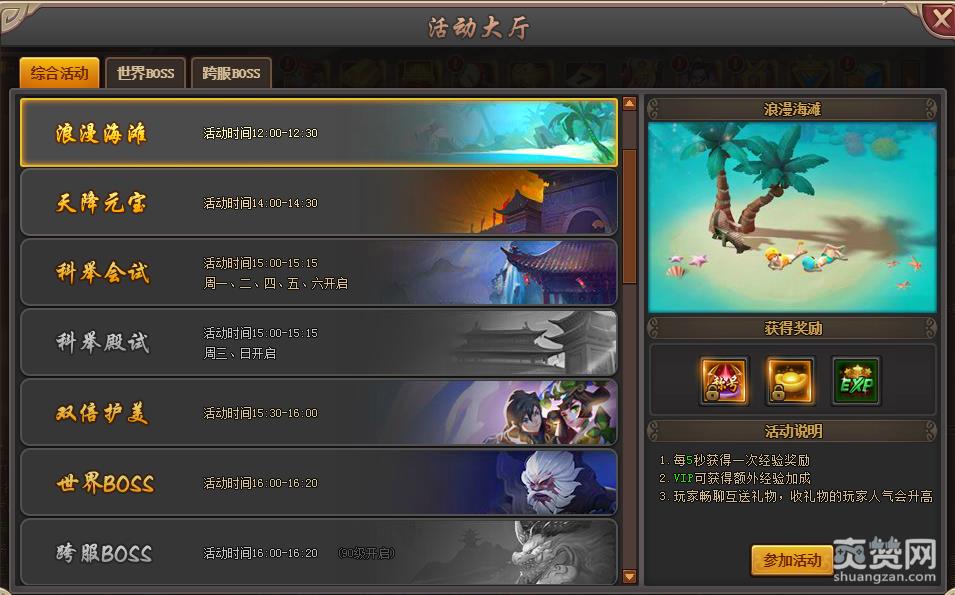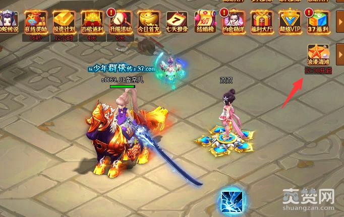 浪漫海滩是少年群侠传中的一个悠闲的挂机升级方式,每天12:00~12:30开启,可在游戏界面点击进入。