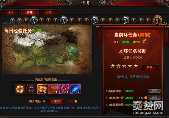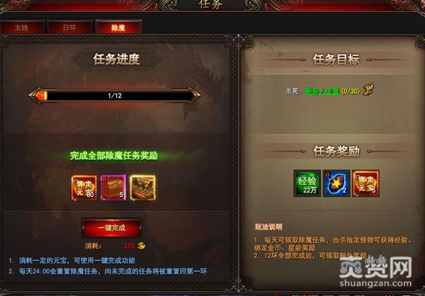除魔任务每日可执行12环,完成任务可获得大量经验及道具奖励。
