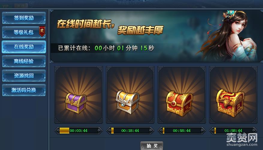 1、每天在线达到一定的时间就可以有一次抽取奖励的机会。