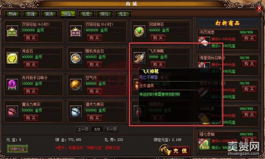 玩家完成主线任务的过程,系统会赠送一些飞天神靴给玩家,当然大家平时若需要用到这种道具,可以进入到商城的绑金栏去购买,每组99个飞天神靴售价为88888金币。如果玩家成为任意等级的VIP等级,将可以不用飞天神靴,每天都可以无限次享受快速传送功能哦。
