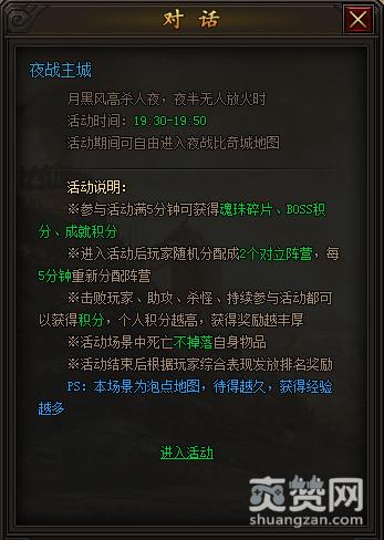 参与到龙魂沙城夜战比奇活动必须完成主线任务。活动时间是每天19:30至19:50。