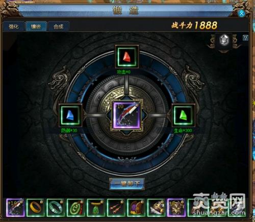 宝石镶嵌:每件装备都有三个宝石镶嵌孔,选择一件有多余镶嵌孔的装备,再点击界面右侧宝石栏中的宝石,即可将宝石镶嵌到装备,提高相应的属性。