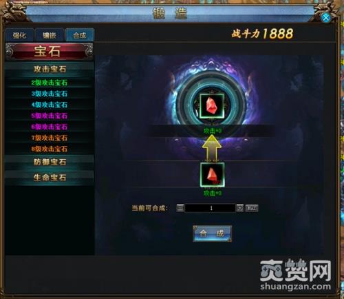 宝石合成:宝石被分成三类:攻击、防御、生命,各有不同的作用。且每种宝石有8级品质,品质越高属性越好。凑足相应的宝石数量便可合成更高一级品质的宝石。