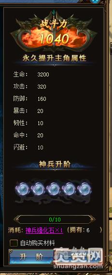 对神兵进行升阶将会消耗神兵强化石,当升阶值满可点亮一颗星。三阶段之前,点亮五颗星则直接升级到下一阶。第四阶开始,点亮五颗星之后还需额外使用神兵突破丹,让突破值到达某一标准时,神兵才会升级到下一阶。