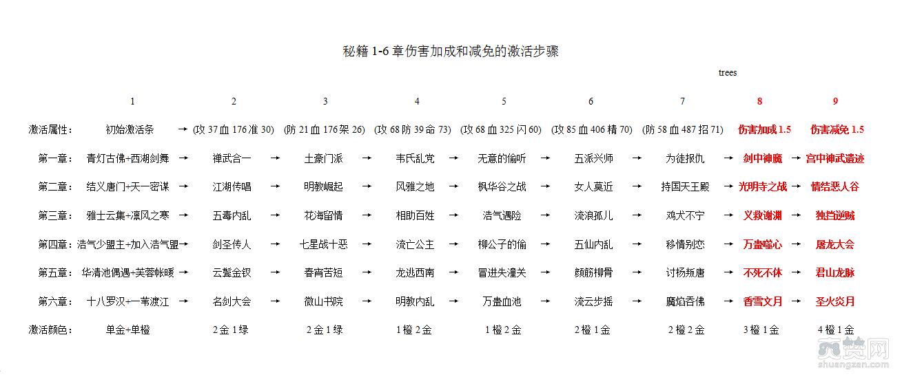 虽然秘籍激活支线错综复杂,但仍然是有规律可循的。下面一张图带您理清伤害加成和减免这条激活支线。