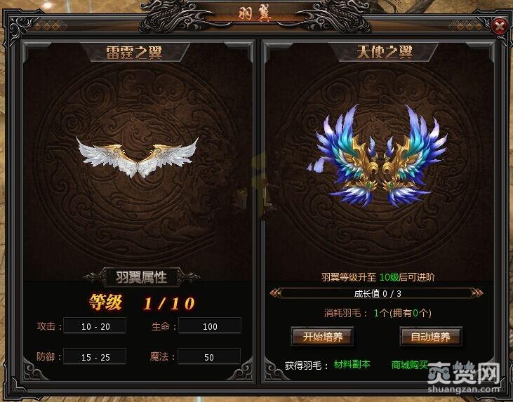当玩家到达60级时在主界面点击“羽翼”按钮,可以进入羽翼界面。目前,羽翼总共分为15阶,每阶都有自己独特的外形和强大的属性加成,羽翼阶级越高,外形更为霸气,属性加成也更为强大。羽翼能提供玩家所需的攻击、生命、防御。魔法等全能属性增幅。