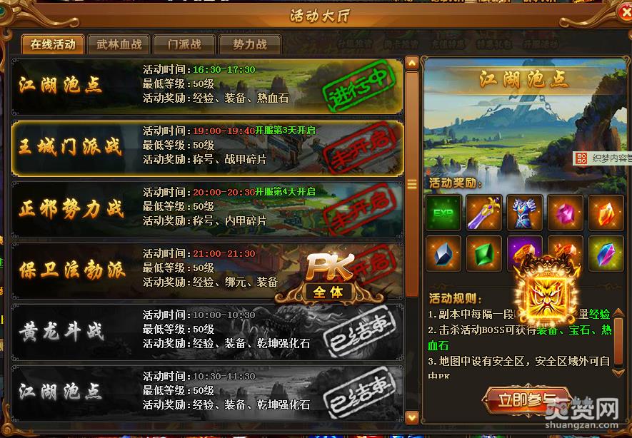 最后就是每天的活动了,小编温馨提醒小R玩家一定要去混活动,这样有些好的材料,宝石,甚至高星装备会直接掉落到您的包包里的,一旦有7星附属以上的装备掉落在您的包包里,那小编恭喜你,市场价格最少也是500元宝啊,绝对是赚翻了!