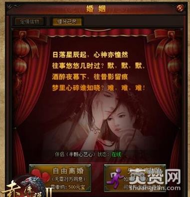 因缘分走进彼此生活,又因距离退出彼此世界,这大概就是赤月传说2一些开启婚姻系统玩家的写照。结婚需要一枚钻戒和两颗红心,那赤月传说2离婚需要什么,现在就来看看吧。