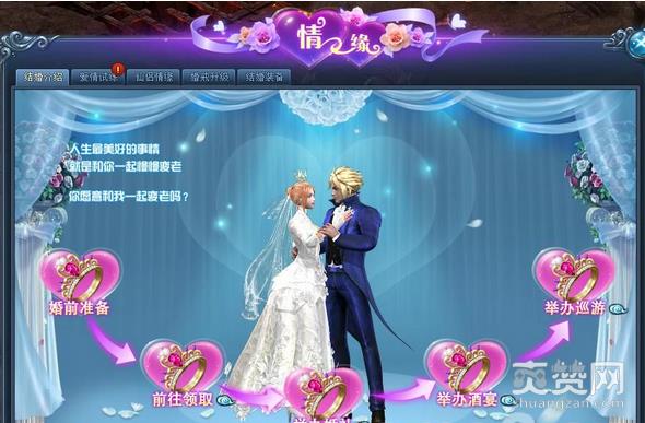 在游戏中,玩家们首先需要通过主界面-角色-情缘进入情缘界面,角色等级≥70开启结婚功能;结婚双方必须都为单身、互为好友、互为异性,同时结婚双方必须同时拥有1枚甜蜜戒指,若情侣两人满足上述的条件,就算是通过了考验, 可以前往NPC瑶姬处进行领证结婚。