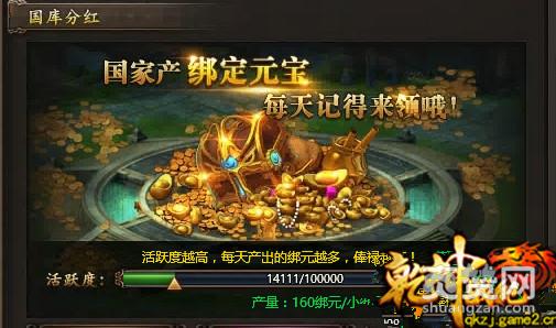 国库系统,国家战事界面打开查看,捐献资源可增加国库资金,每日可领取俸禄,每周可按照功勋排名参与国库分红领取奖励,每周日24点前结算。随着人员的不断活跃,国家就会产出源源不断的绑定元宝!活跃度越高,每天产出的绑元越多,俸禄也就越高。而活跃度的获取主要有3个途径:国家建设、跨服任务和跨服远征;