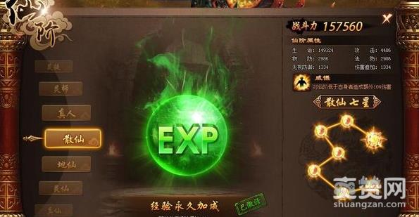 仙阶:激活第4层仙阶散仙时可以活儿100%的永久野外杀怪经验加成,需要激活散仙的最后一星。