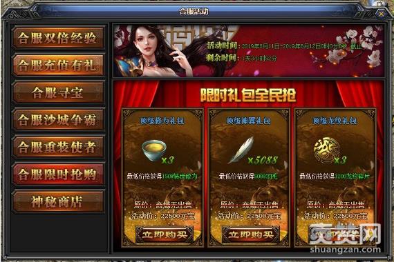 在游戏中,若新老玩家想要参与限时抢购的话,只需要点击游戏界面上方的【合服活动】,再点击【限时抢购】即可。在限时抢购界面中,玩家们一共可以抢购三种商品,分别是: