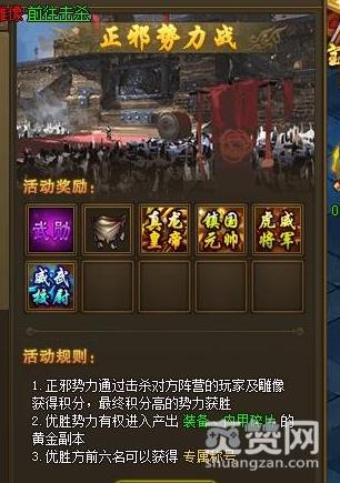 正邪势力战的玩法规则是杀大型雕像获取100积分,杀中型雕像获取50积分,杀小型雕像获取20积分,杀一名敌对势力玩家获取5积分,杀一个小怪获取1积分,那么如果你是高战力玩家,你最佳的选择就是杀雕像。