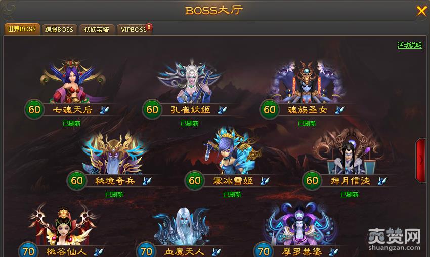 首先,一剑倾城的boss大厅是50级开发的副本。玩家点击右上角活动上的boss大厅进入主界面就可以看到世界boss