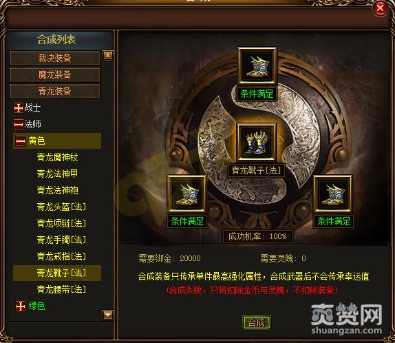 玩家在合成各种装备时,装备的级别越高,合成的成功几率会随之降低。如果装备合成失败的话,只会扣除金币、灵魄,不扣除装备的。玩家所准备的材料里,若有绑定的材料,合出来的装备则为绑定的哦。合成装备只传承单件最高强化属性,合成武器后不会传承幸运值。