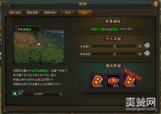 玩家们一旦护送成功就能够获得个人威望和积分,根据各个国家把宝藏车运输到襄阳的先后来排名,第一名国家积分+3分,第二名国家积分+2分,最后一名国家积分+1分;若国战结束还未送达,则无积分。结算时,只有第一名会显示“国战胜利”,其余均显示失败。游戏结束时按照各国积分奖励国家经验。