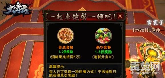 大摆宴席这一活动会在每天中午12:00-12:30期间限时开启,活动持续半个小时,而且进入门槛非常低,只要满足达到40级这一条件就可以进入,不费吹灰之力就能获得海量经验奖励。进入以后玩家们可以自主选择想吃的套餐,目前有普通套餐和豪华套餐两种可以选择。普通套餐需要消耗5万绑定银两,豪华套餐需要消耗10元宝,每人只能选择一种用餐方式,点击即可享受高倍经验;如果不选择,经验就只能够领取单倍经验了。