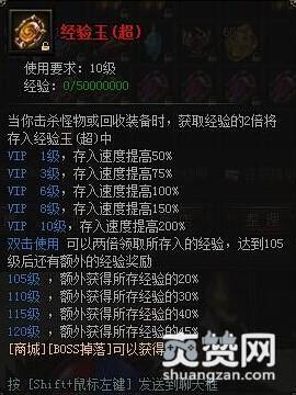 经验玉分为:经验玉(小)、经验玉(中)、经验玉(大)、经验玉(超)4种品质,品质越高,能够存入的经验越多,收获的经验越多。可以通过击杀BOSS获得,也可以直接在商城购买,当背包中放有经验玉以后,在日常打怪的过程中,会有相当于击杀怪物2倍的经验存入经验玉中,在回收装备的过程中,也会将回收装备的2倍经验存入经验玉中,当经验玉存满经验后,在游戏正下方会出现“EXP”图标,提示您可以使用经验玉。