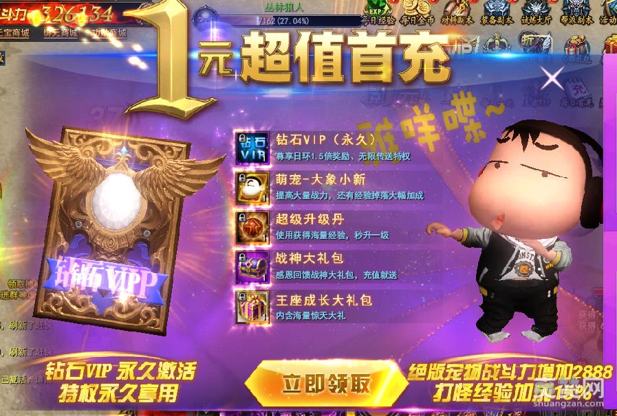 小编首先要介绍一下1元超值首充活动的奖励有哪些,首充一元的奖励包括:永久钻石VIP、萌宠-大象小新、超级升级丹*1、战神大礼包*1、王座成长大礼包*1。其实单从首充一元的奖励来看,绝对是物超所值,并且相当划算。小编是建议所有神印王座玩家参与到首充一元中来的,尤其是其中的萌宠小新能够为大家带来不错的属性加成与经验加成,钻石vip更是能在日常活动中获得1.5倍的奖励,在游戏前期更快的建立优势。