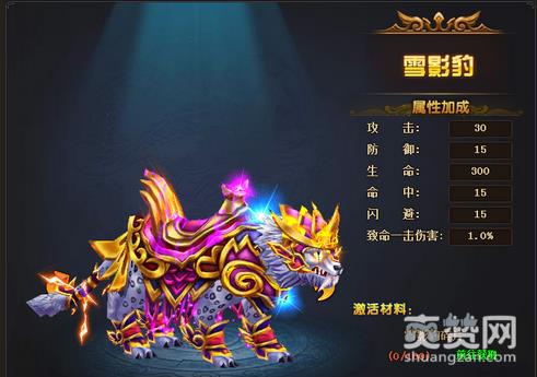 在披风界面中,我们可以在坐骑类中找到血影豹,点击即可查看其详情,血影豹的造型独特,酷炫拉风,激活的同时还可以为人物带来30攻击、15防御、300生命、15命中、15闪避和1.0%的致命一击伤害等属性加成,非常实用。