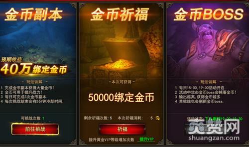 玩家还可以通过击杀金币BOSS和金币副本来获得金币,这两种玩法几乎一样,玩家都需要打倒强力的金币BOSS来获得大量的金币奖励,区别只是金币副本是玩家单独挑战,获得的金币奖励较少,而金币BOSS则是所有玩家一起挑战,获得金币也多很多。