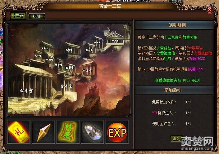 当玩家等级达到60级后,黄金十二宫这一活动就将自动开启。在界面上可找到“十二宫”的活动图标,进入到活动界面,就可了解到对应的活动规则。赤月传说黄金十二宫是全天开放的,玩家要参加十二宫活动,点击活动面板中的“进入”按钮,就能进入活动地图。每天玩家们都有1次免费进入的次数,VIP玩家可额外多获得1次。若玩家每天的免费次数用完,就可以使用金矿再增加一次进入机会,金矿可通过挖矿玩法获得。