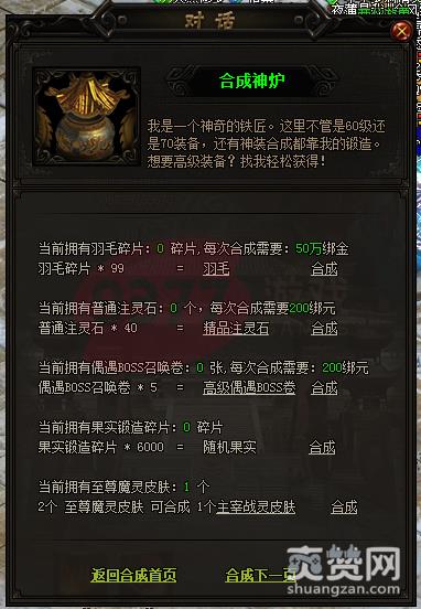 游戏中,有不少道具是可以通过合成方法获得的,诸如一些羽毛、精品注灵石等。玩家要想合成这些道具的话,就可到赤月土城里,找到npc“合成神炉”。大家与这位npc对话之后,就能找到“道具材料合成”的选项。每种道具材料的合成,所需要的材料均不同的,另外,部分道具材料的合成需消耗一些金币或绑定元宝,各种材料道具的合成规则,如下:
