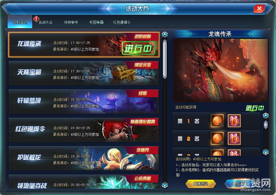 在游戏中,玩家们达到等级45级以上方可参与龙魂传承这一活动,传承活动中最主要产出的就是各类的进阶材料,因为传承活动中囊括了游戏中的各大玩法,分别是法宝、坐骑、羽翼、龙魂、灵宠,想要参与龙魂继承的话就需要在17:00时前来参与了。玩家通过传承活动对BOSS造成伤害,根据造成伤害量进行排行,活动结束后根据排行榜的排名发放相应奖励。活动奖励包含大量的进阶丹,成长丹和资质丹,还有众多稀有的装备等待玩家们的获取。