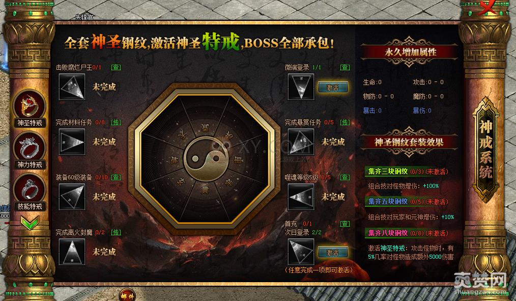 特戒分为“神圣特戒”、“神力特戒”、“技能特戒”等种类。每个特戒都有8块钢纹碎片所组成,神力强大的特戒能够为玩家们带来强大的属性加成,每块钢纹碎片也具有非常强大的能力。每块钢纹碎片都有各自的获取途径,比如说完成材料任务60次,登录微端,噬魂等级达到5级等等,不尽相同。但许多小伙伴们认为需要集齐所有钢纹碎片才算有用,其实不是这样的,玩家们集齐到3块、5块、8块都能够产生一定的效果,而永久的属性加成则是要集齐8块才能获得的哦。