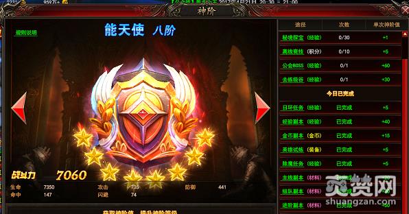 除了每天挑战副本以外,玩家还可以通过其他的方式来获得神阶值。首先就是完成日环任务和除魔任务,玩家每成功完成一环的任务就可以获取5点的神阶值,玩家总计可以从每日任务中获得160点的神阶值,其次,玩家还可以通过参加英雄试炼来获取神阶值,玩家每次挑战英雄试炼就可以获得5点的神阶值,总计可以获得40的神阶值奖励。另外,玩家在练级谷中练级达到1个小时,就可以获得30点的神阶值