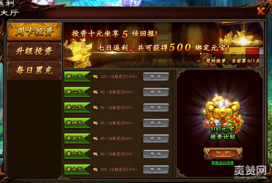 其次是通过投资返利,来获得绑元。其中包括周卡投资和升级投资。周卡投资会在玩家购买的当日起,给予玩家绑元返还。第一天和第七天返还100%,第二天和第六天返还60%。七日返利后,一共可以获得500绑定元宝。只要投资10元就可以坐享5倍回报啦!