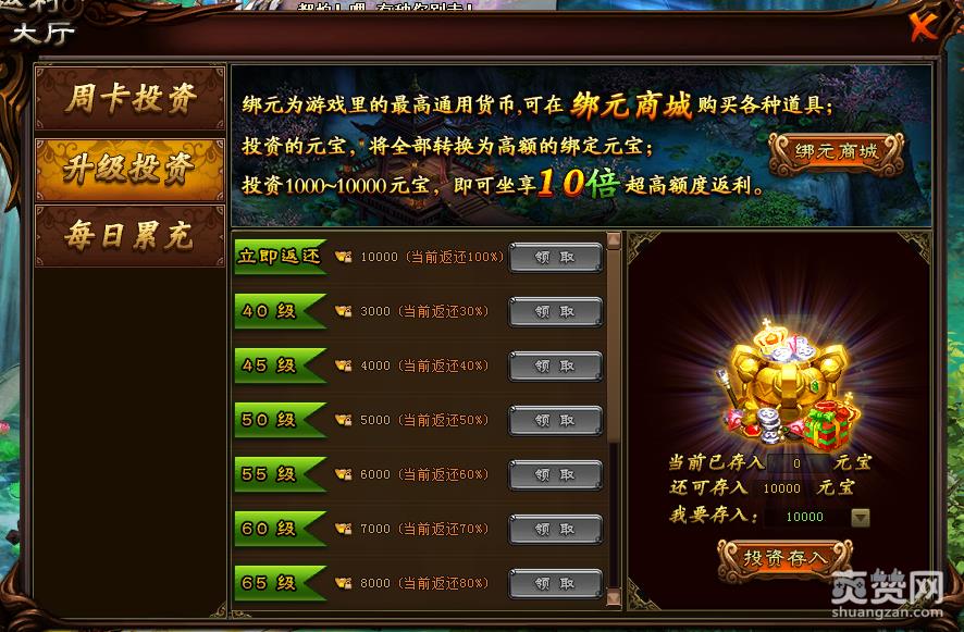 升级投资,也是获取绑元的快捷途径之一。而且随着玩家等级的上升,奖励也会越来越丰厚。玩家可以选择1000元宝,4000元宝和9000元宝来进行投资。投资元宝后,立即返还100%绑元。从此,再也不用担心绑元不够花了。